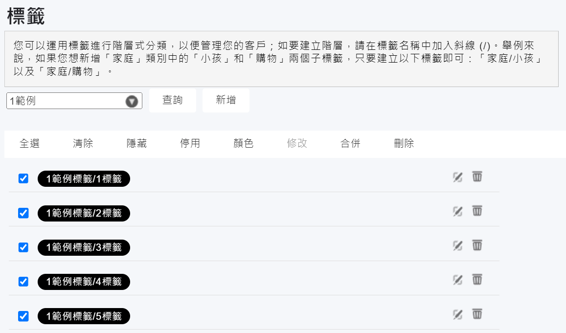 2. 標籤管理畫面以列表呈現,並採用分頁載入的方式,在有大量標籤資料時,能有效避免一次全部載入,占用過多瀏覽器資源。各標籤右方都有「修改」及「刪除」的按鈕;在列表中勾選標籤後,可以批量隱藏/停用/修改顏色/刪除或合併,並提供查詢後全選的功能,可針對符合條件的標籤進行批量作業(如下圖)。