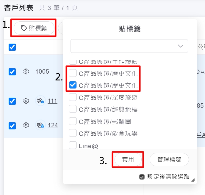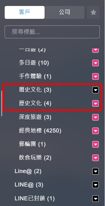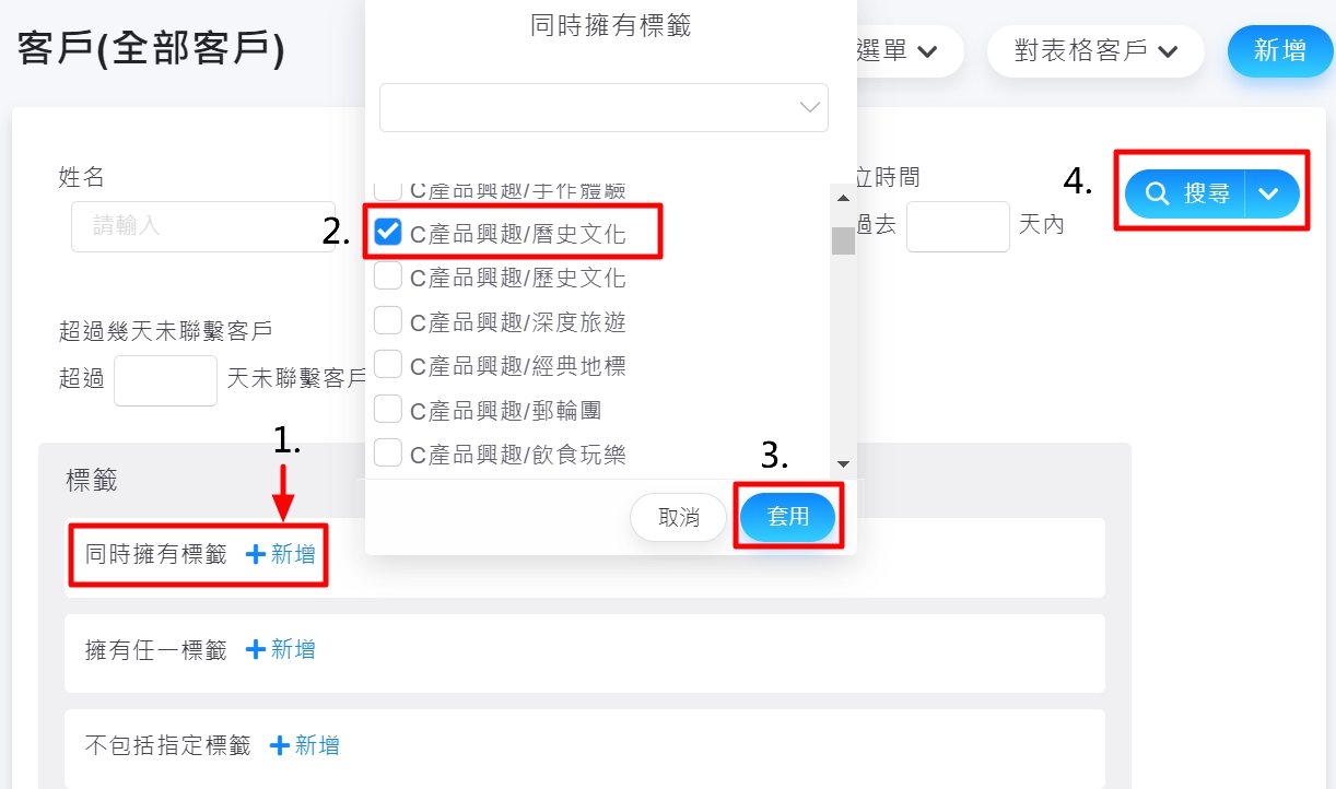 2.選擇【標籤>同時擁有標籤】點擊【+】,篩選出擁有錯誤標籤之客戶
