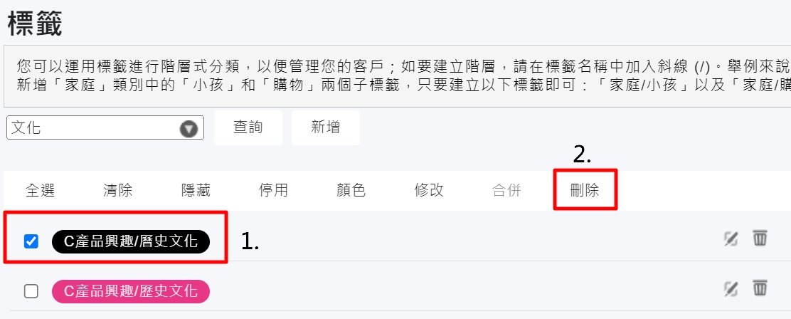 4.刪除錯誤標籤:【管理>資料>標籤】,進入頁面點選錯誤標籤並刪除