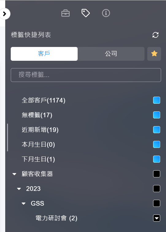 標籤快捷列表內的最愛標籤分頁內,增加了一組按鈕,可以於「客戶最愛標籤」與「公司最愛標籤」之間切換。