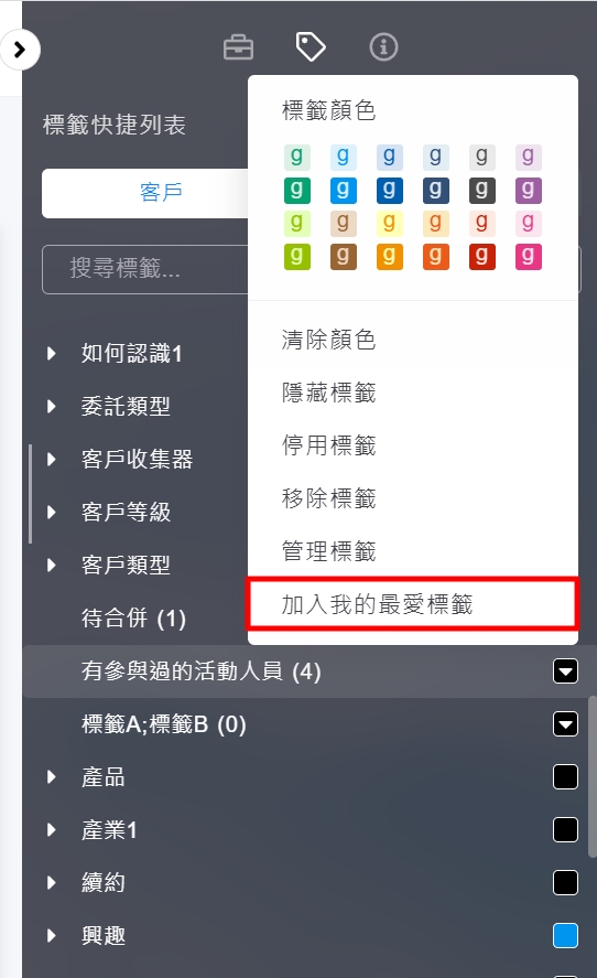 請點開標籤右側的圖示,選擇「加入我的最愛標籤」即可。