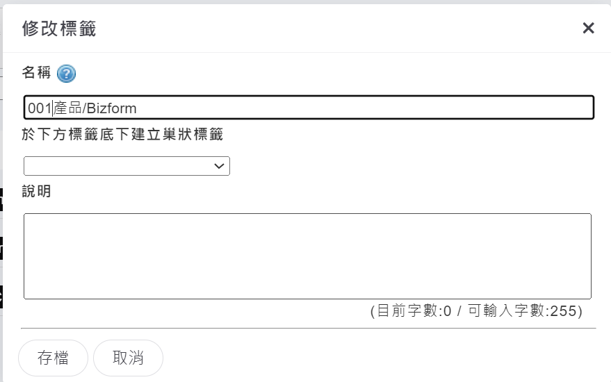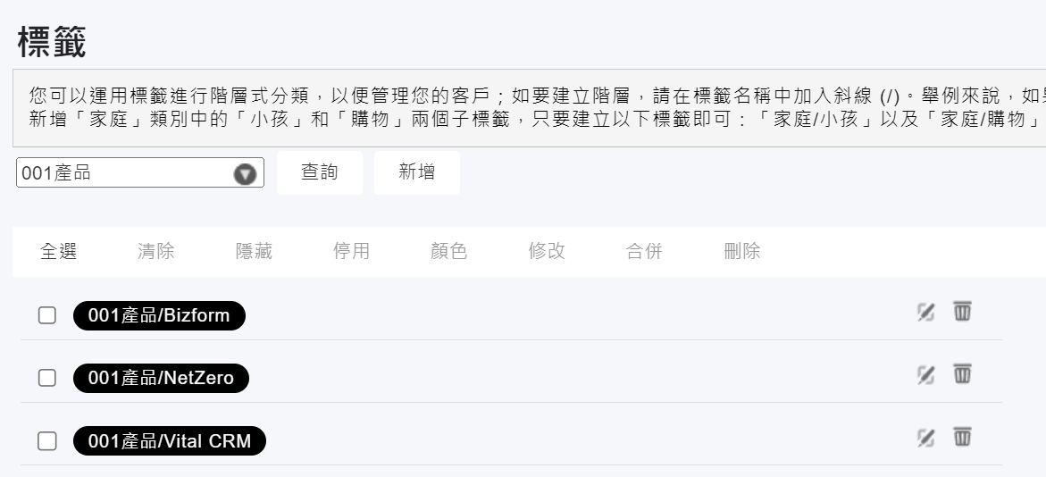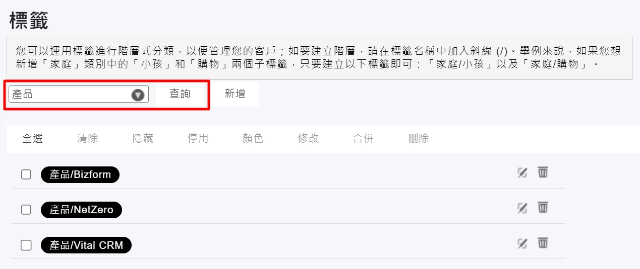 1. 請至標籤管理的頁面,先輸入第一階層的標籤名稱,將該層級下的所有標籤查詢出來。