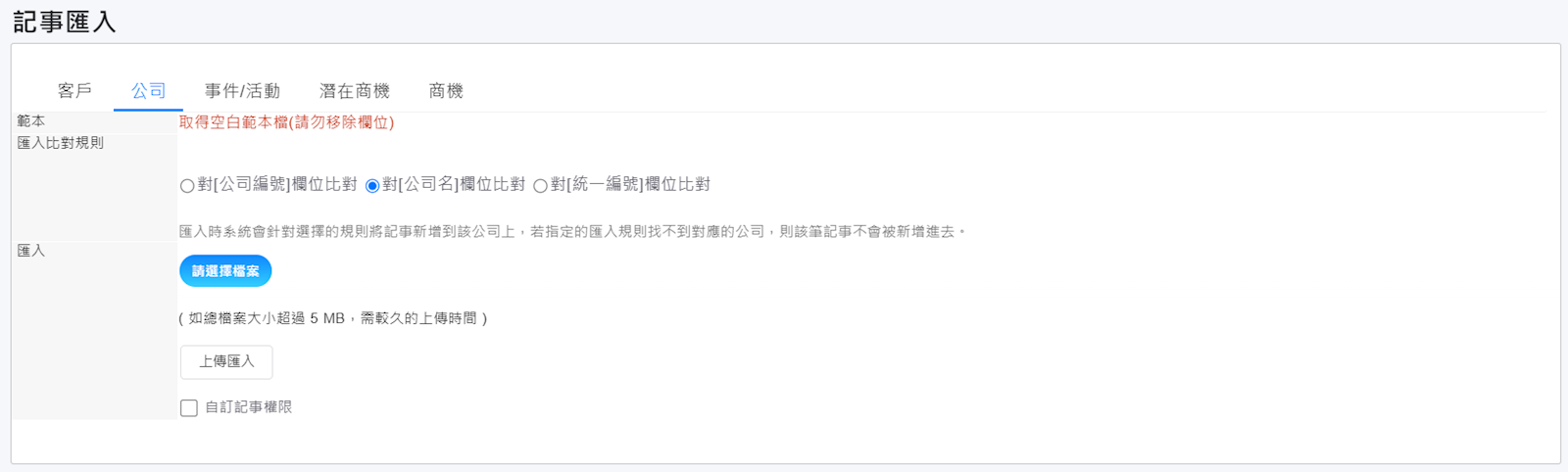 *使用者必須具備客戶的「增加記事」與「匯入」權限,於記事匯入功能畫面內才會看到該種資料的記事匯入功能