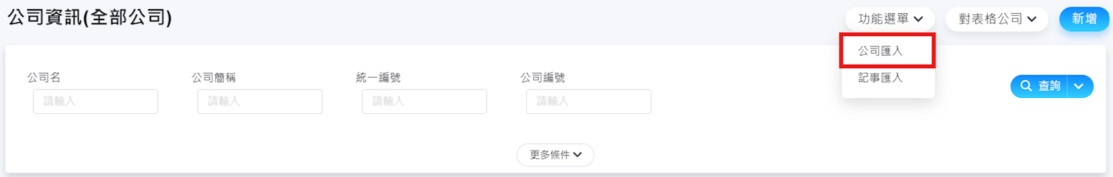 匯入規則可以選擇要以【公司名】、【〔公司編號〕欄位比對】或【對[統一編號]欄位比對】。如比對規則若選【公司名】,此為必填欄位,若選【〔公司編號〕欄位比對】,則此欄為必填欄位,【對[統一編號]欄位比對】,則此欄位必填。