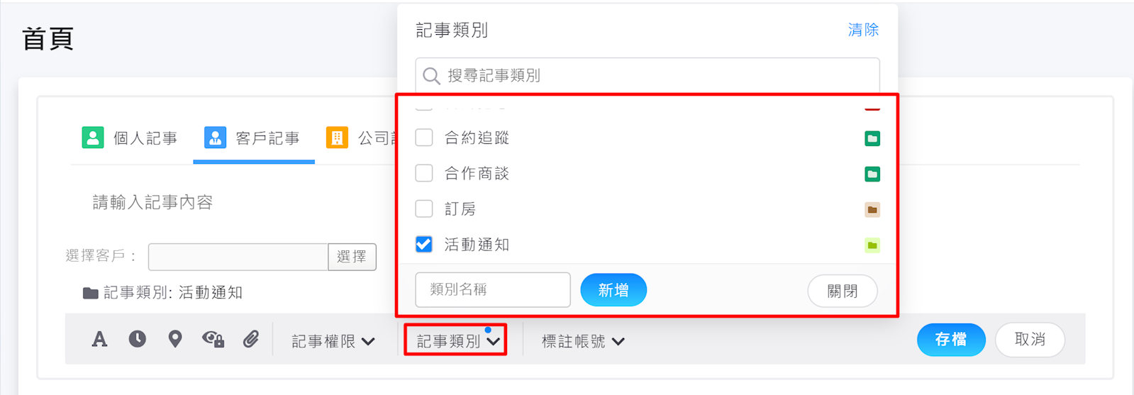 3. 新增好類別後,在新增記事時即可選擇記事類別