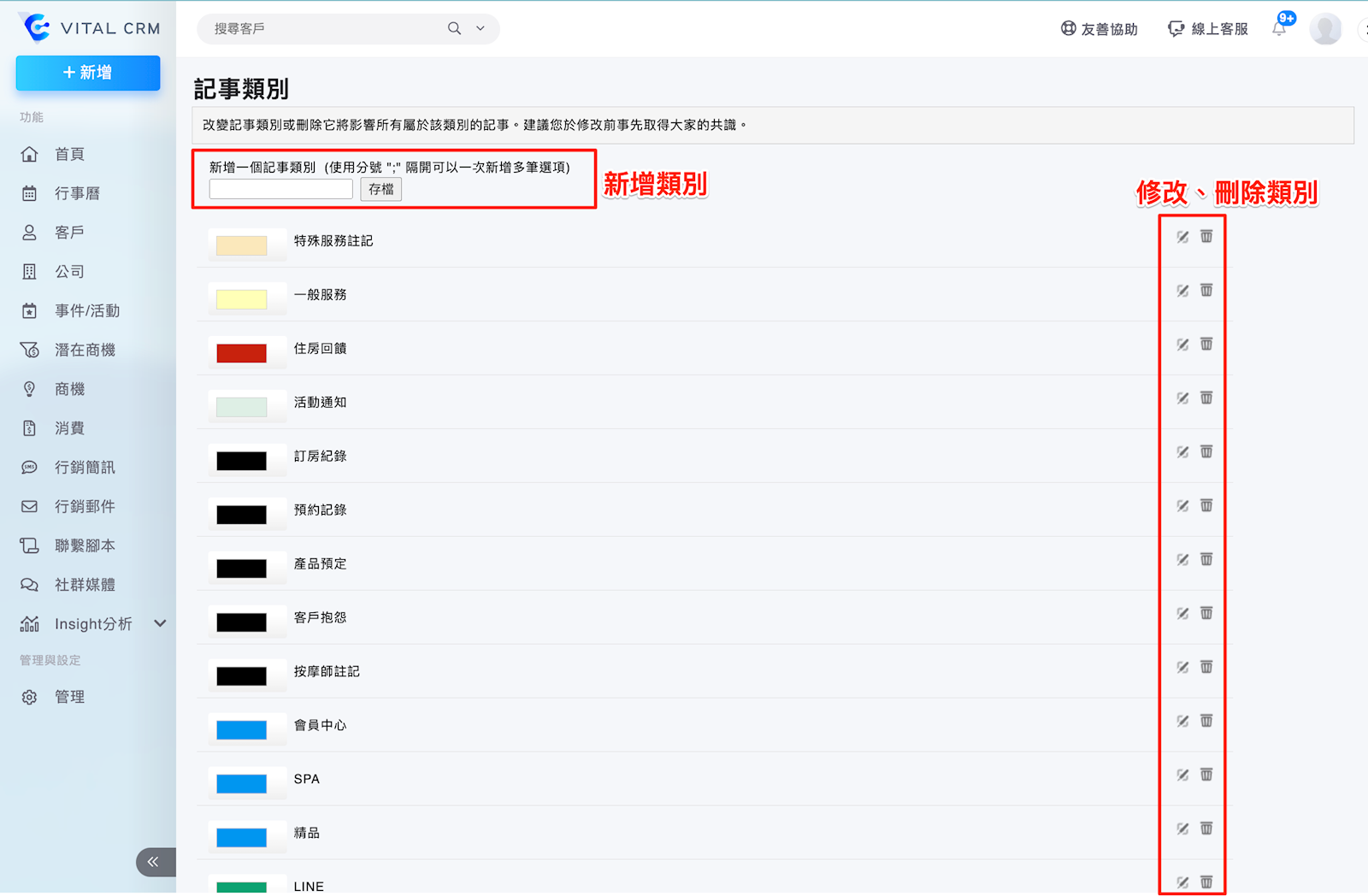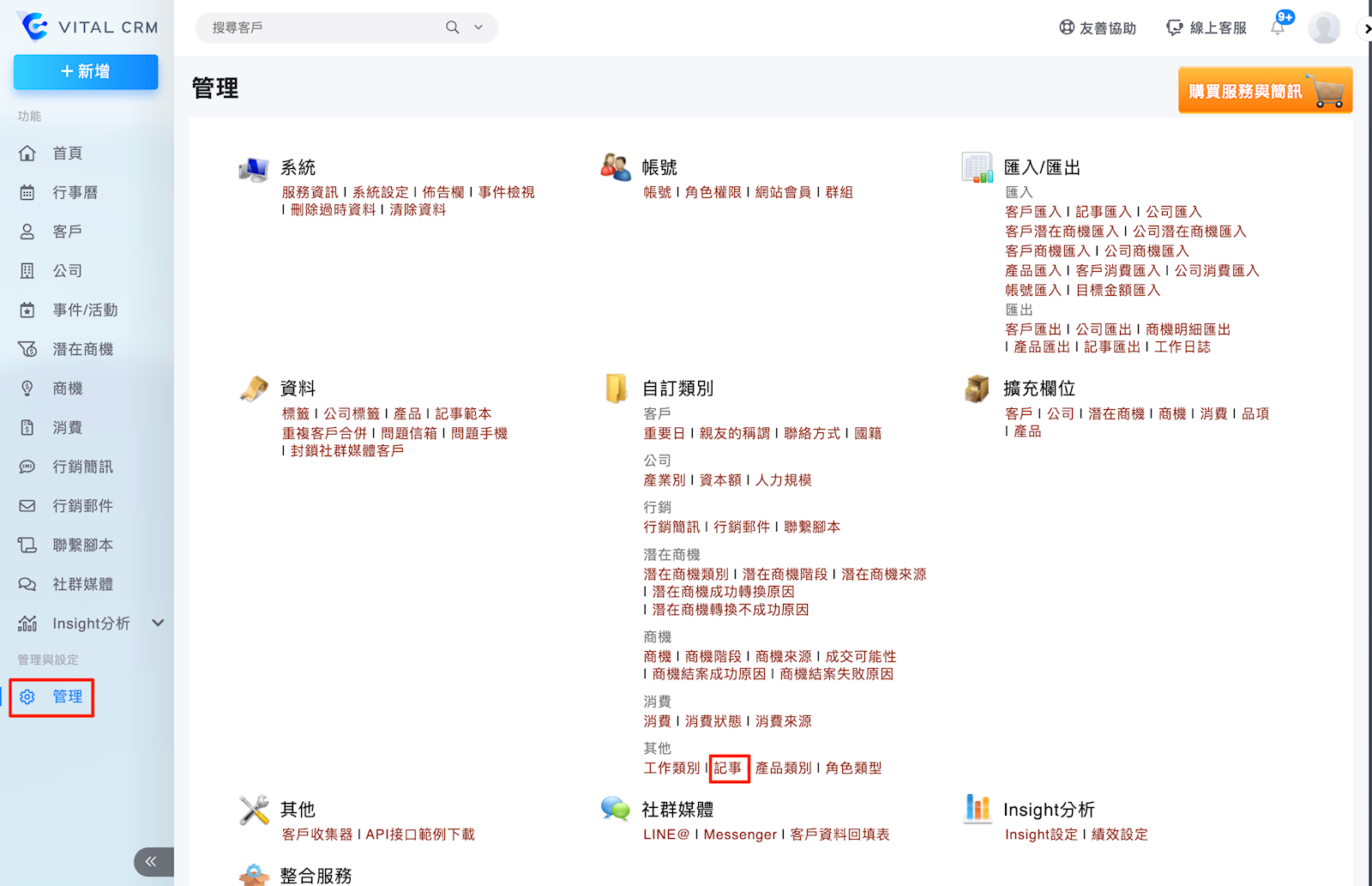 1. 從【管理>自訂類別>記事】進入設定頁面