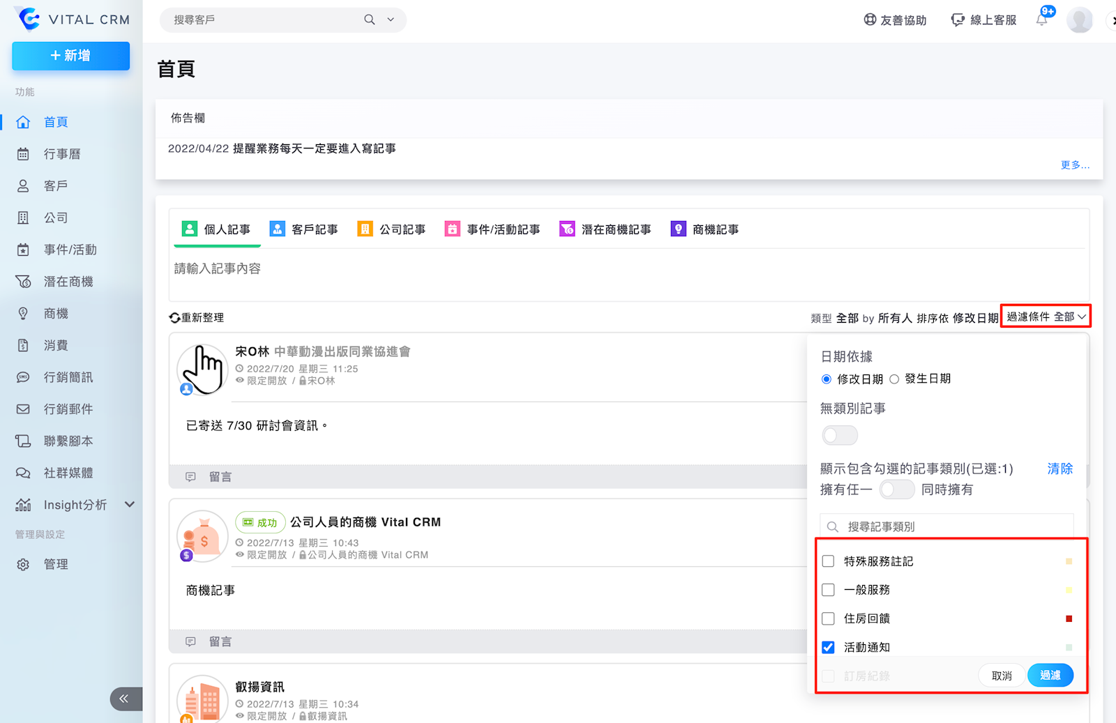 5. 搜尋記事時,可以利用過濾條件,並以記事類別作為依據查詢