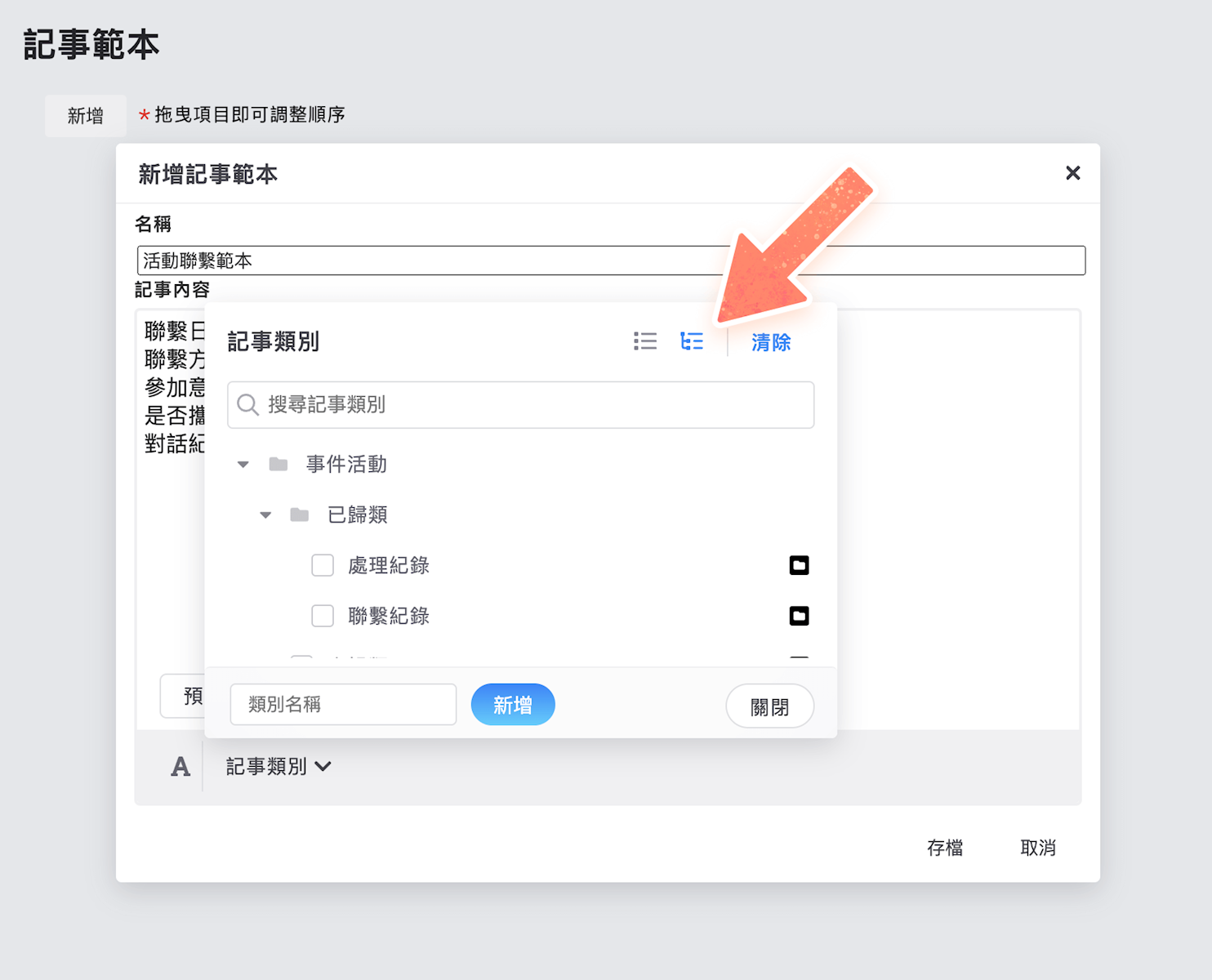 編輯記事範本時,選擇記事類別可以切換至樹狀檢視模式。