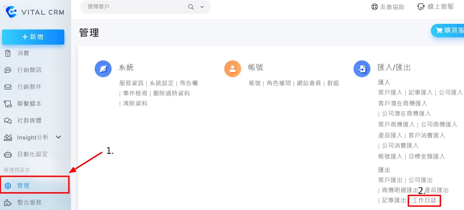 1.由左側選單下方【管理】進入,選擇【匯入∕匯出】→【工作日誌】