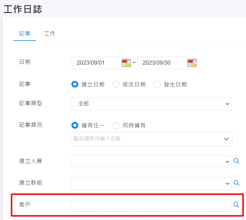 2.於【記事】的部分輸入查詢條件,即可篩選客戶檢視記事。