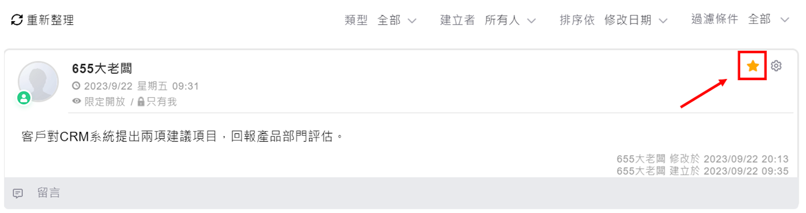 Vital CRM可以讓使用者關注重要的或與自己相關的記事,點擊每則欲關注記事右上方的「星星」按鈕,即可將該則記事在所屬的功能中置頂。