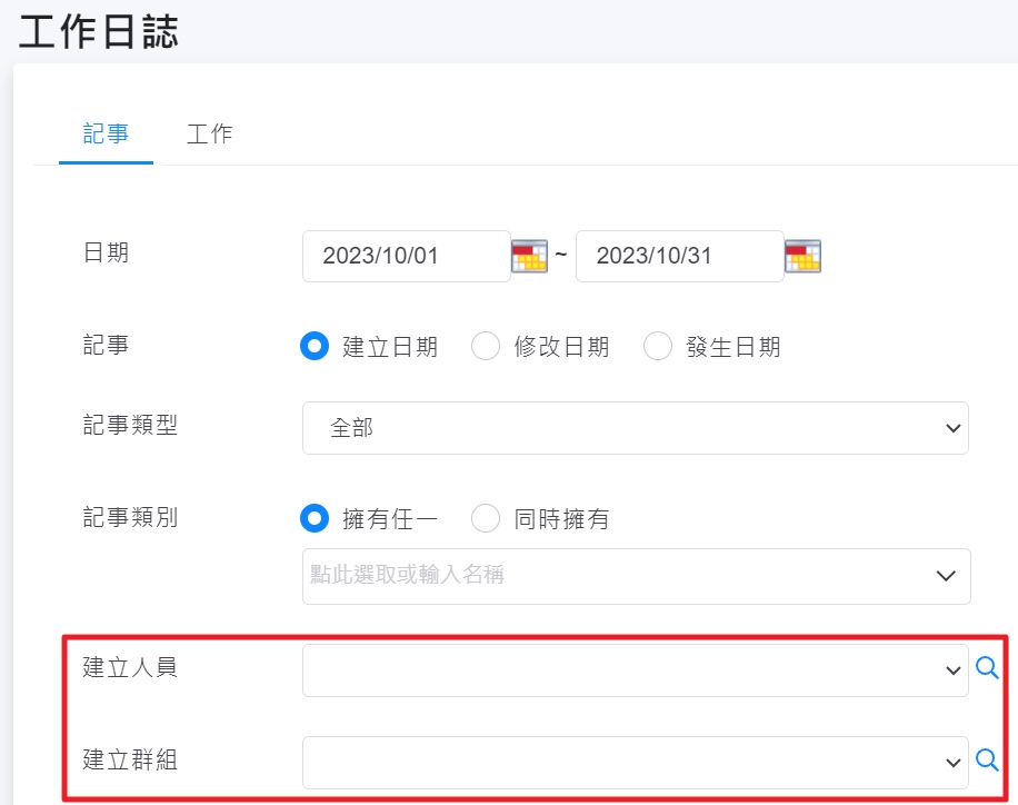 2. 進入工作日誌畫面後,即可根據建立人員或建立群組來查詢(匯出)其他人的記事了。