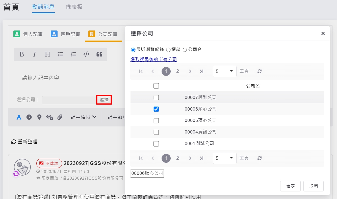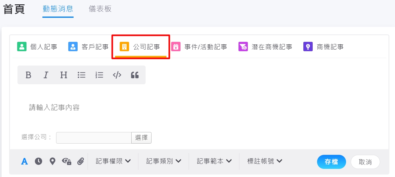 請在系統首頁選擇「公司記事」類型,選擇公司,並輸入記事內容