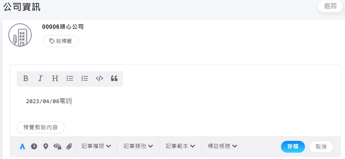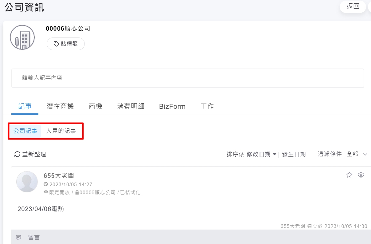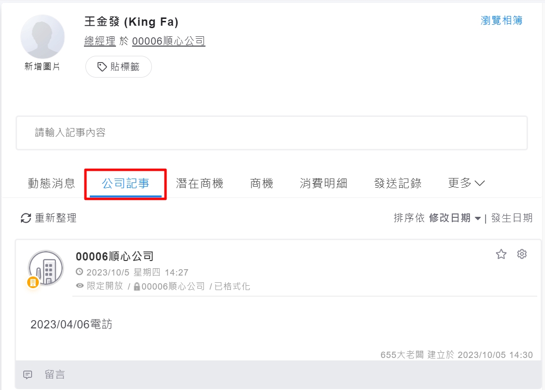 而客戶資料的頁籤中則新增了「公司記事」分頁,可以查看該客戶所屬公司的記事