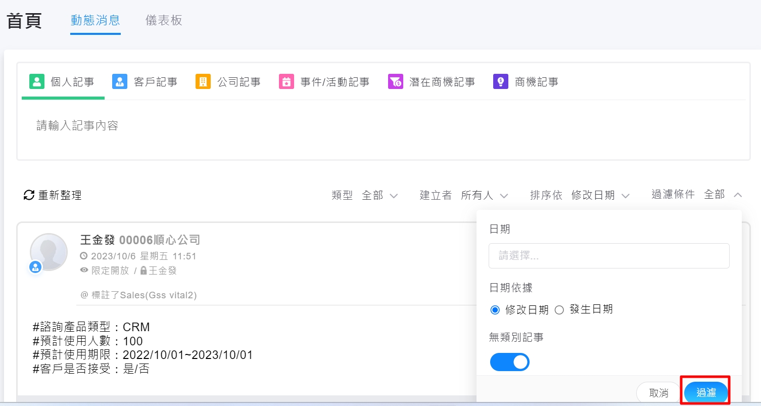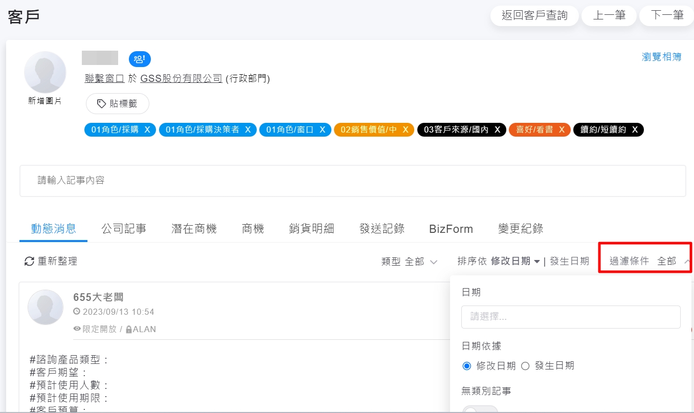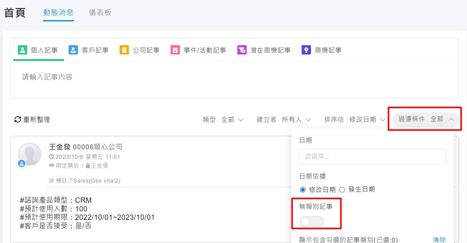 客戶、公司、商機等詳細資料畫面的記事頁籤也有同樣的篩選條件可使用: