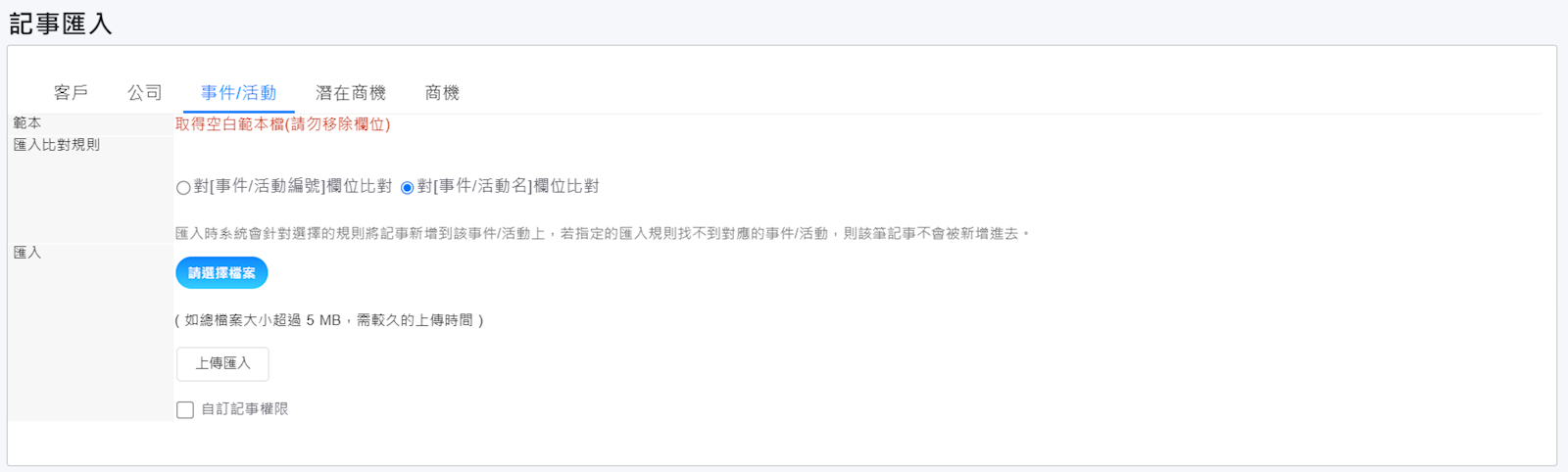 *使用者必須具備客戶的「增加記事」與「匯入」權限,於記事匯入功能畫面內才會看到該種資料的記事匯入功能