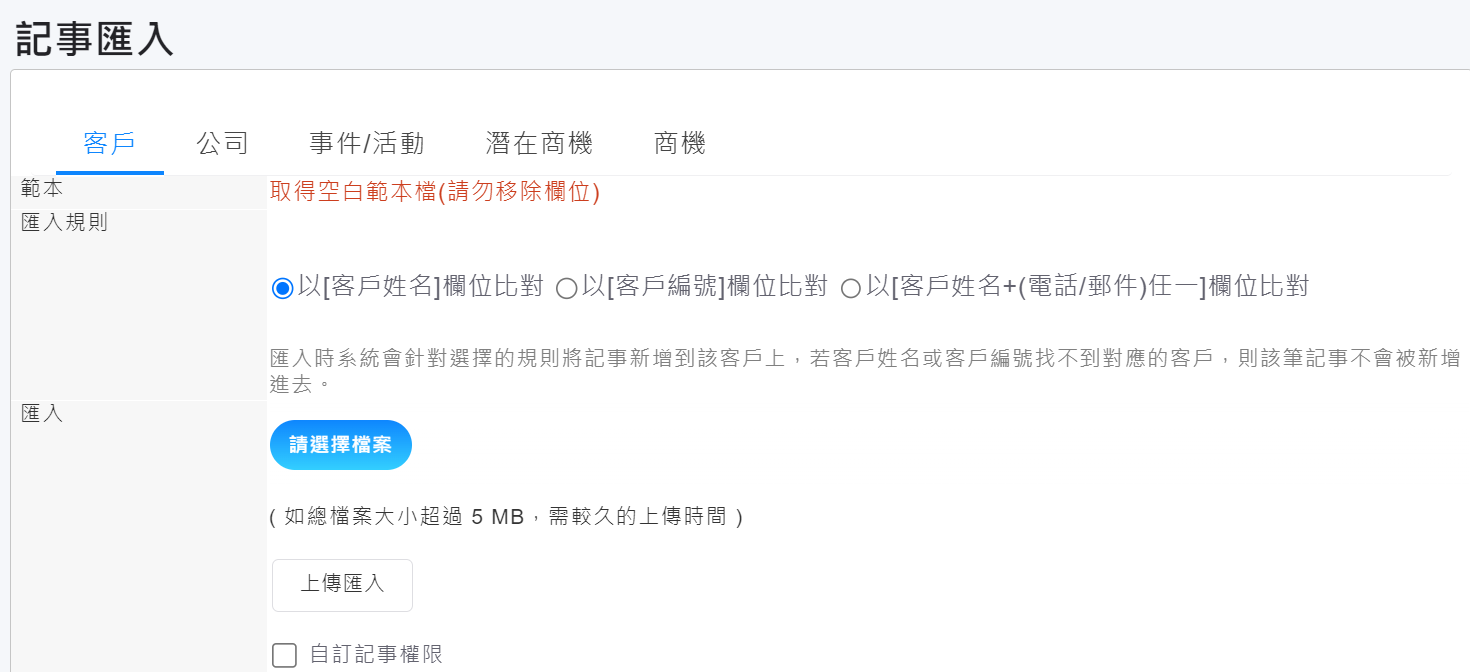 2. 開啟編輯畫面後,您可下載「空白範本」,依照欄位將資料輸入。請注意,不可刪除欄位。檔案上傳前,請選擇「匯入規則」,若有權限設定的需求,請在下方勾選「自訂記事權限」,確認檔案資料無誤後,即可匯入至系統中。