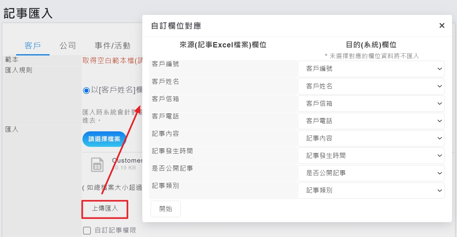 *若檔案來源的欄位非範本內的欄位名稱,點擊「上傳匯入」按鈕後會自動跳出欄位對應的功能,在指定正確的欄位對應後,系統即可進行更加精準的比對;若檔案來源依照範本欄位輸入,也請檢查對應欄位是否正確。