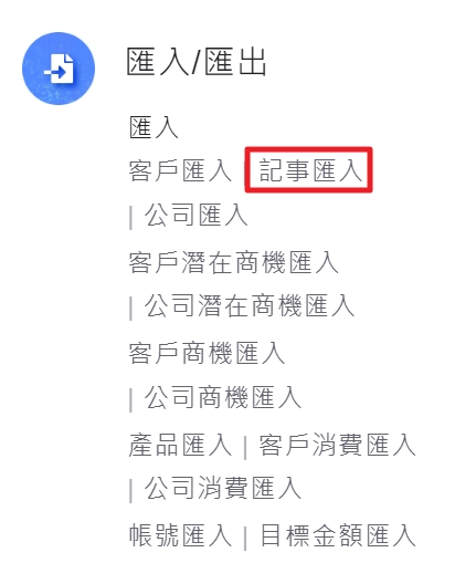 1. 請由左側功能列【管理>匯入/匯出>記事匯入】之路徑進入,您可以選擇要匯入客戶、公司、事件/活動、潛在商機或商機的記事。