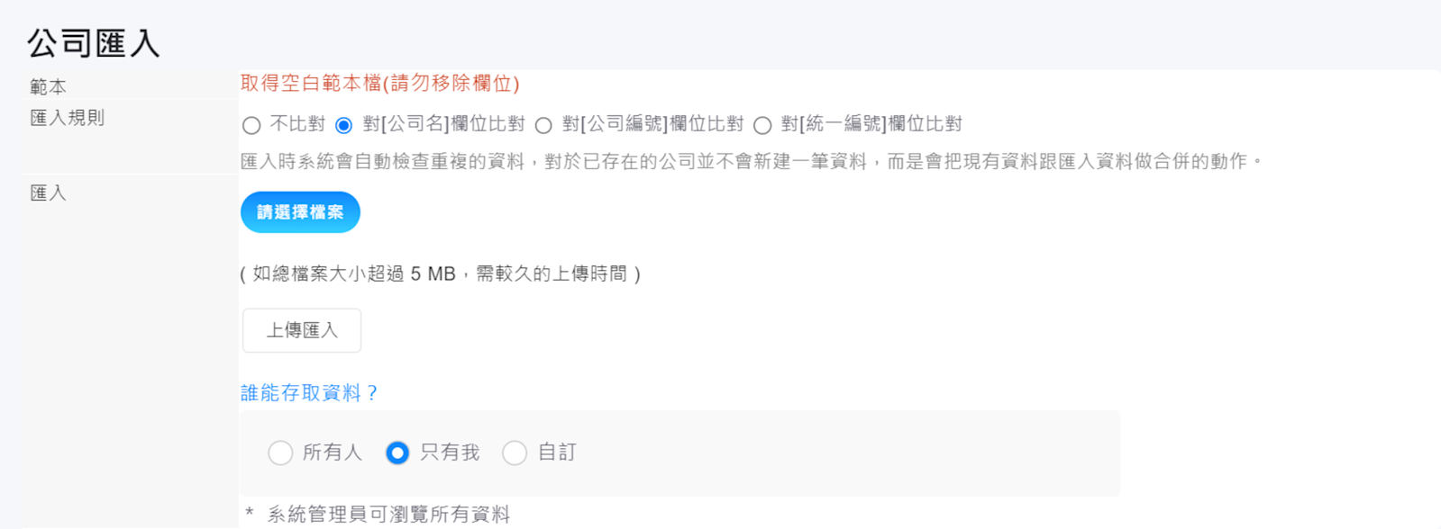 提醒您:在執行Excel匯入客戶功能時,允許一併匯入公司資訊,系統會以【公司編號→公司名】的順序進行比對。建議後續在使用匯入功能時,先將公司資訊匯入,再匯客戶資訊,透過客戶資訊內的公司名/編號來與公司綁定,以更加良好地維持資料的一致性與完整性,也可以避免公司資料重複建立。