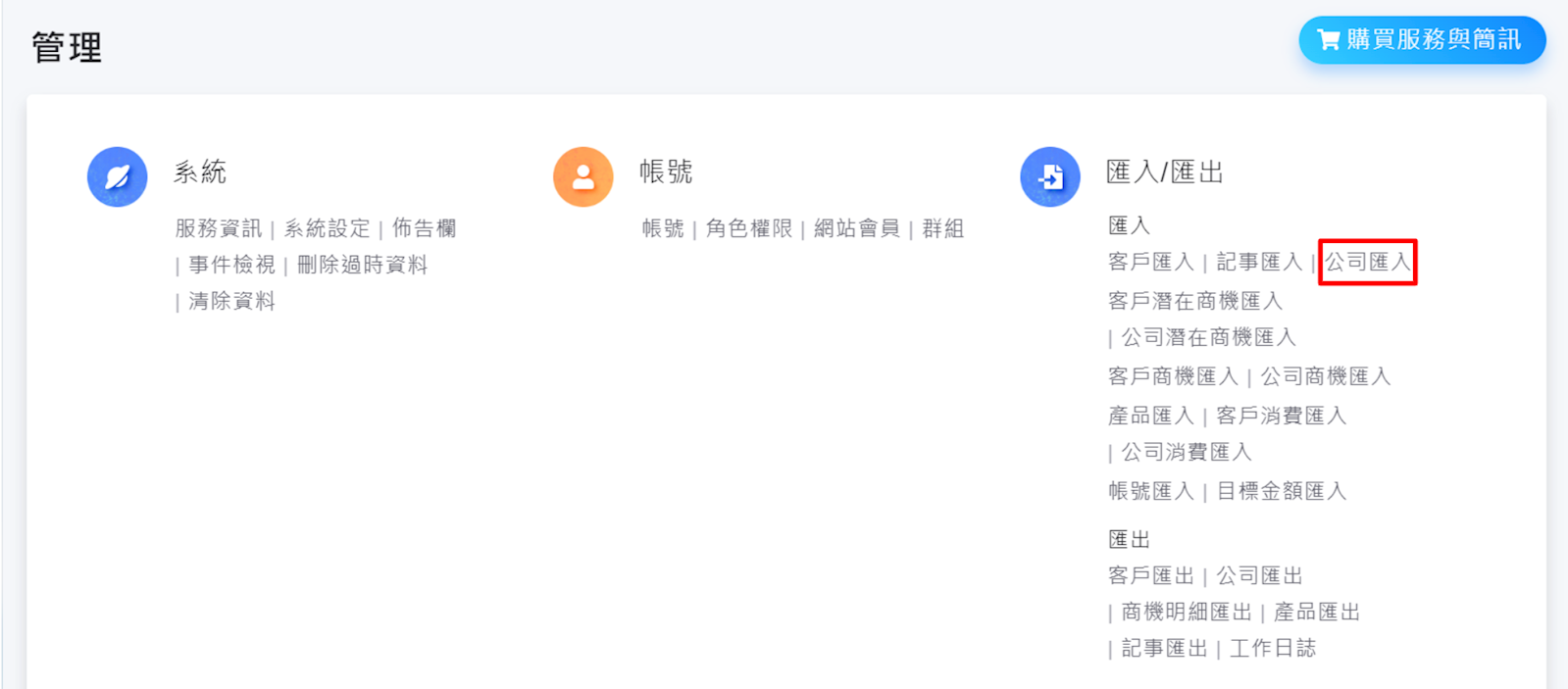 *如果您是系統管理員,也可以透過【管理>匯入/匯出>公司匯入】進入功能。