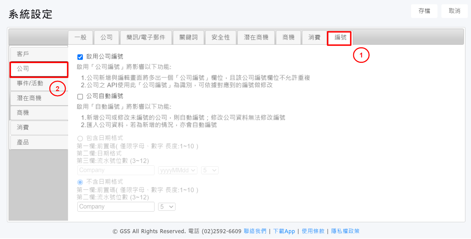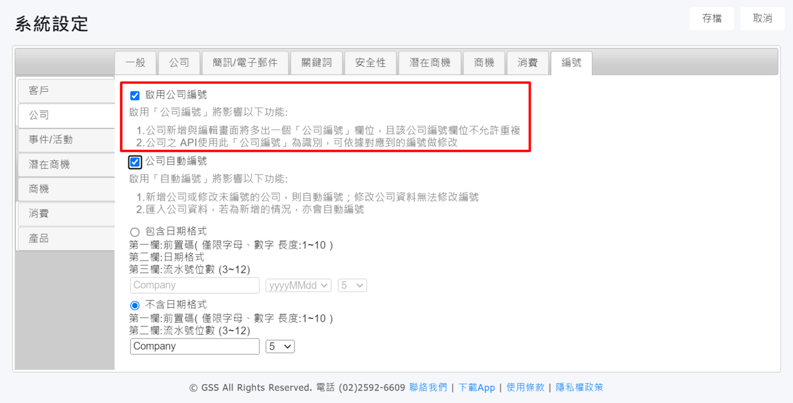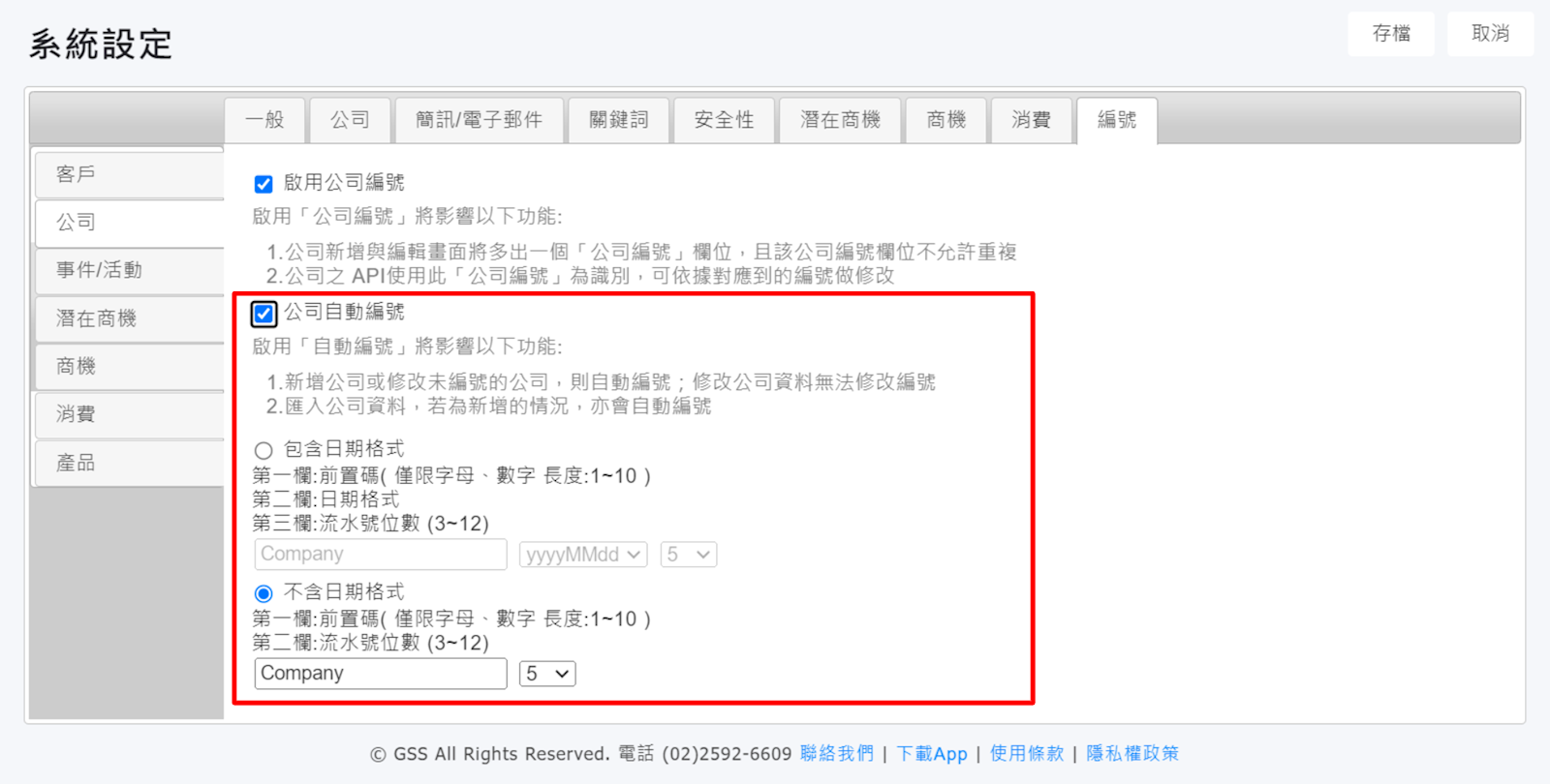 ※自動編號:請先勾選【啟用公司編號】後,即可勾選【公司自動編號】,並依據您需要的格式設計編號的方式,包括【包含日期格式】與【不含日期格式】,設定完畢後,系統將在您新增公司時自動加上編號,且此編號日後無法修改。