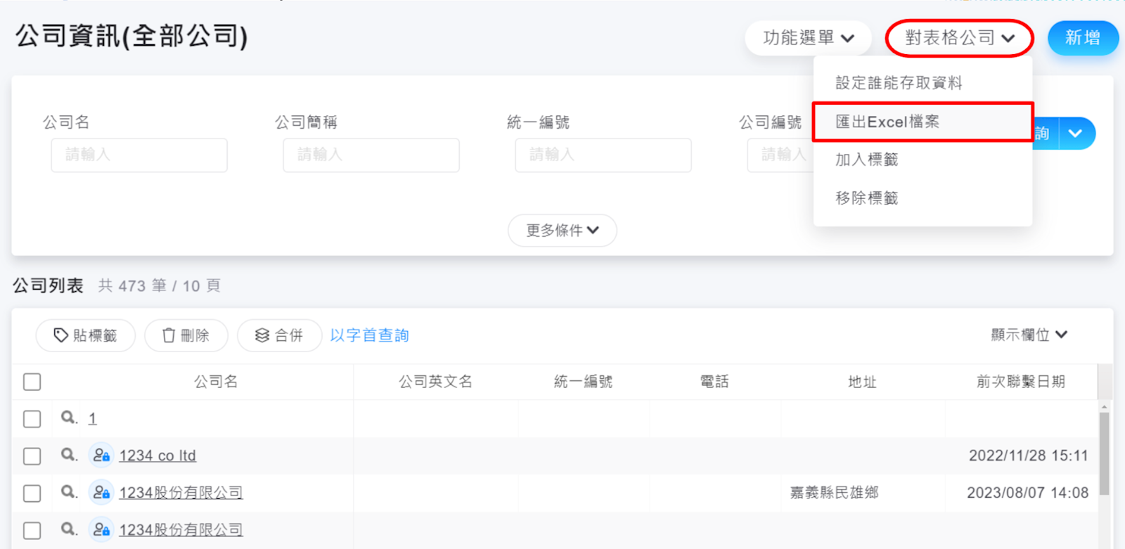 若需匯出資料,請在右上角【對表格公司】中選擇【匯出Excel檔案】。