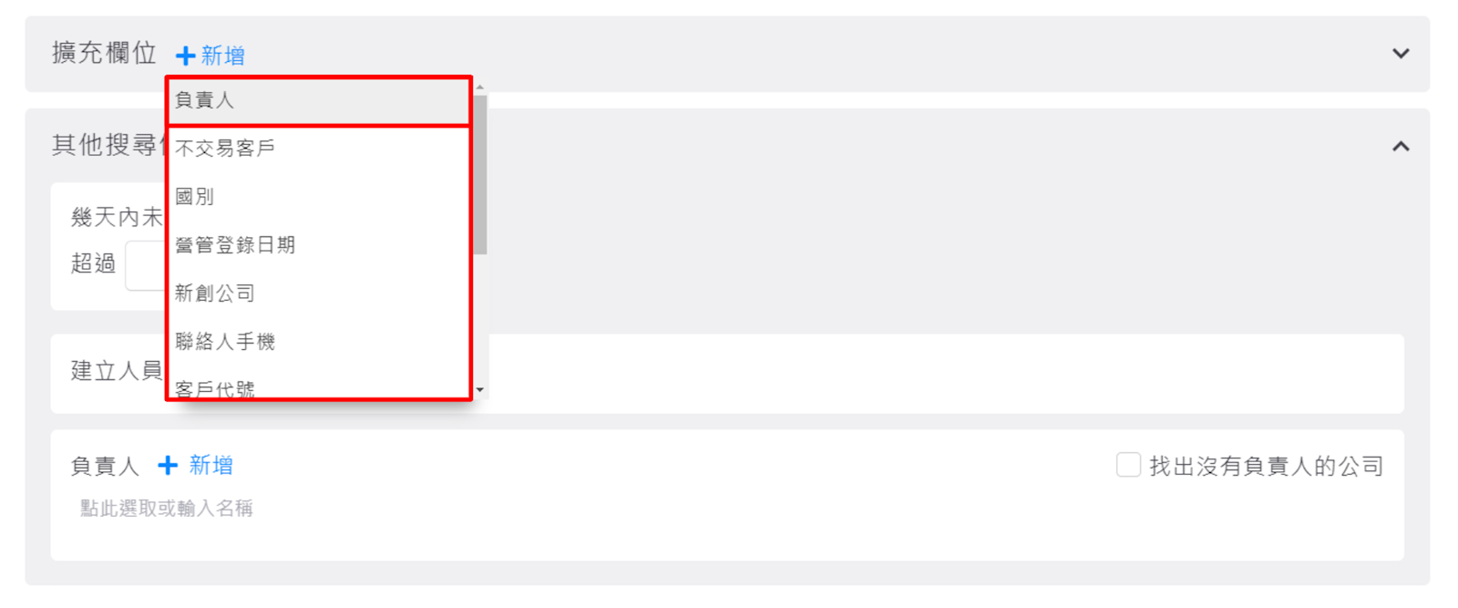 1.於列表左方【公司>更多條件>擴充欄位>新增】,此時會出現下拉選單,請在此選擇您欲搜尋的欄位名稱(可複選)。