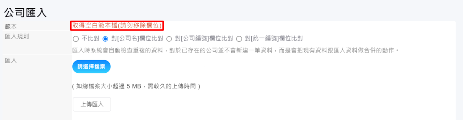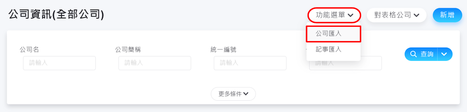 1. 請至列表左上方【公司>功能選單>公司匯入】功能進入操作頁面(如下圖)。