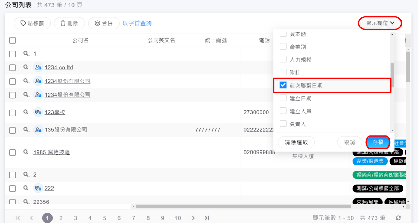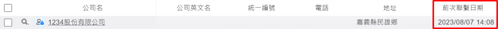 請至列表左上方【公司>公司列表>顯示欄位>前次聯繫日期】,存檔後,即可在列表中看到使用者與該公司最近一次聯繫的日期。