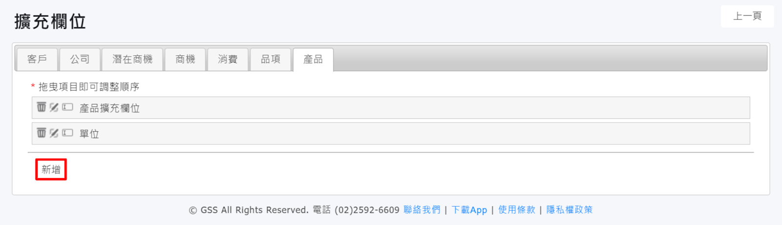 2. 點選下方【新增】按鈕,即可開始自訂產品擴充欄位。