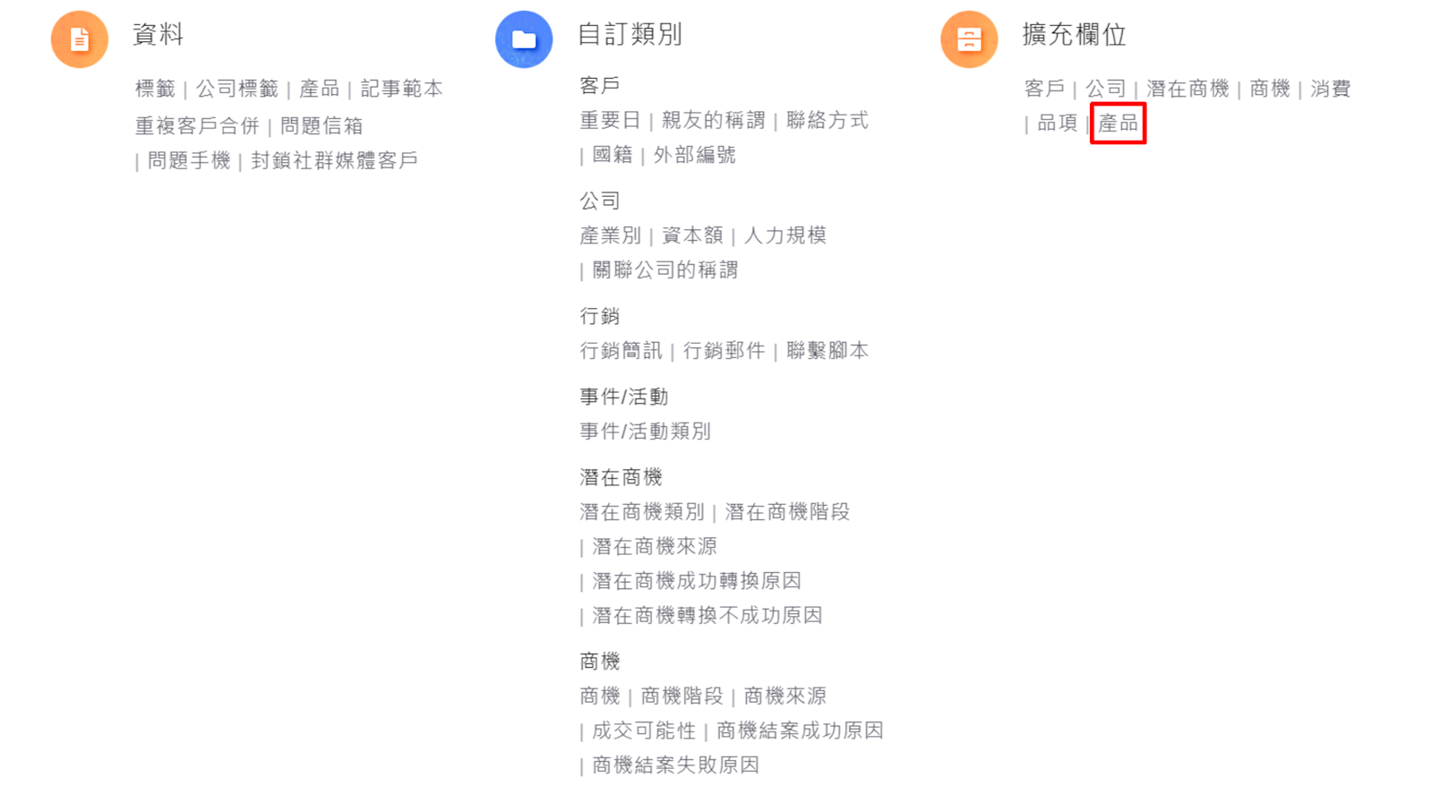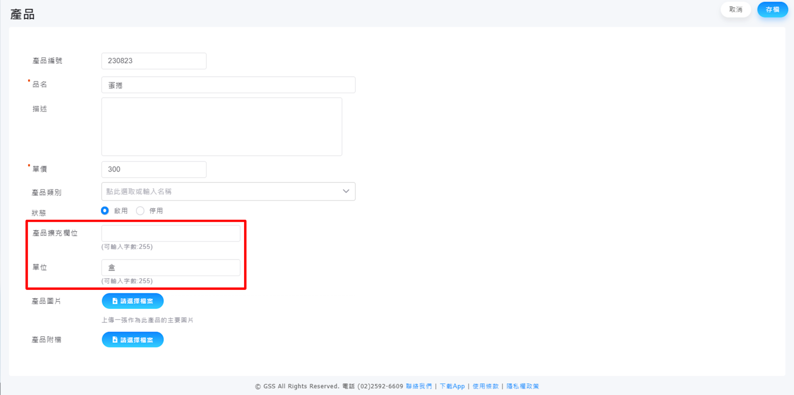 在【產品】功能中,為滿足使用者在設定時能有更大的彈性,使用者可以藉由設定產品的擴充欄位,在編輯產品時以類似於加入產品相關明細(如產地、產期、保固期限等等)的額外資訊。