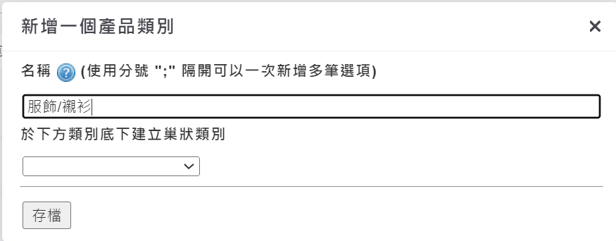 進入畫面後,可以運用類別進行階層式分類,以便管理您的產品;如要建立階層,請在類別名稱中加入半形斜線 (/)。舉例來說,如果您想新增「服飾」類別中的「襯衫」和「外套」兩個子類別,只要建立以下類別即可:「服飾/襯衫」以及「服飾/外套」。