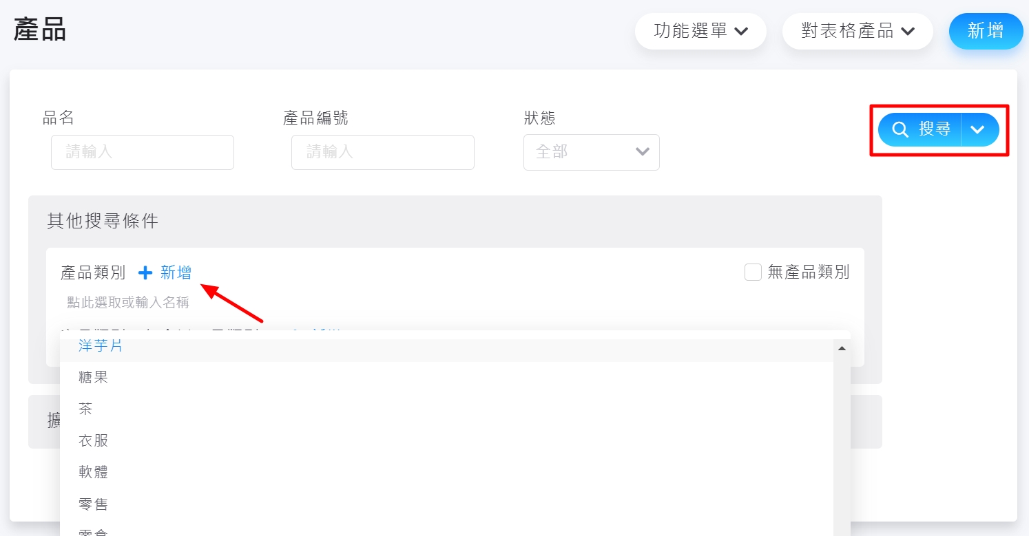 3. 在「其他搜尋條件>產品類別」欄位中,點擊「新增」並輸入或直接在下拉選單中找到您欲查詢的類別,選好之後點擊右方的「搜尋」按鈕即可。