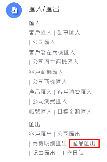 請至【管理>匯入/匯出】中點選【產品匯出】,即可匯出系統內所有產品。