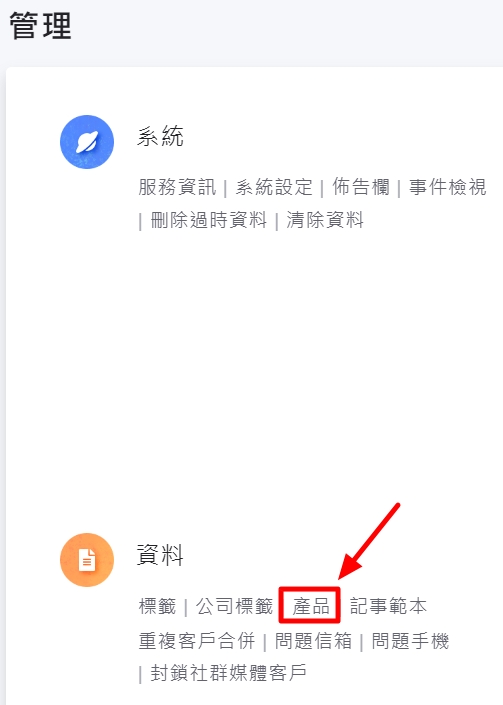 1.左側選單下方點擊【管理】,進入頁面後選擇【資料】欄位下方的【產品】
