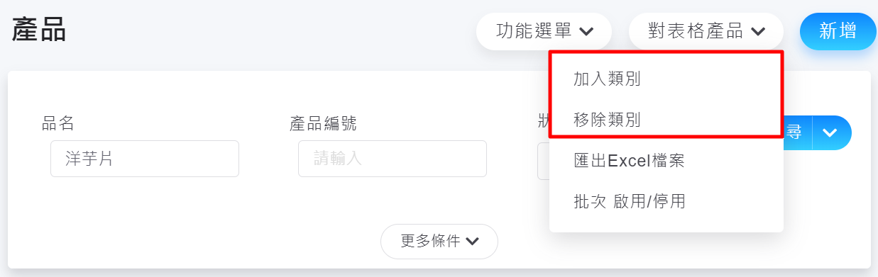 2. 查詢出需要更改的產品,再如下圖所示點選右方【對表格產品>加入類別/移除類別】,即可開始修改產品類別。