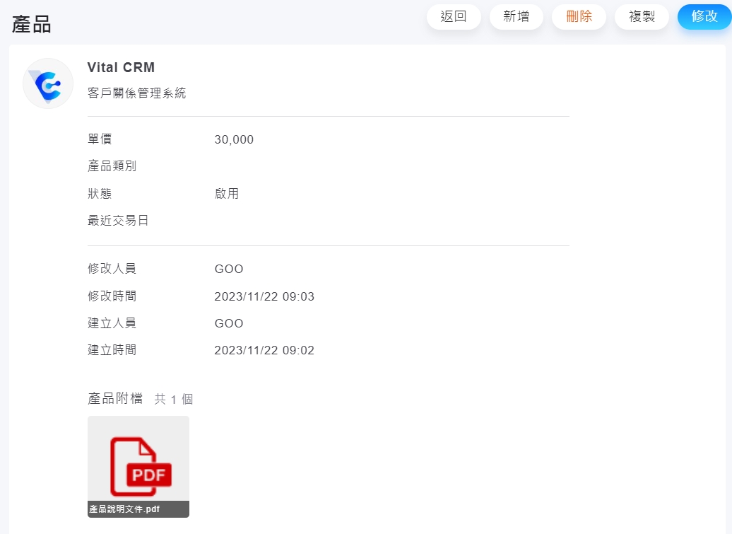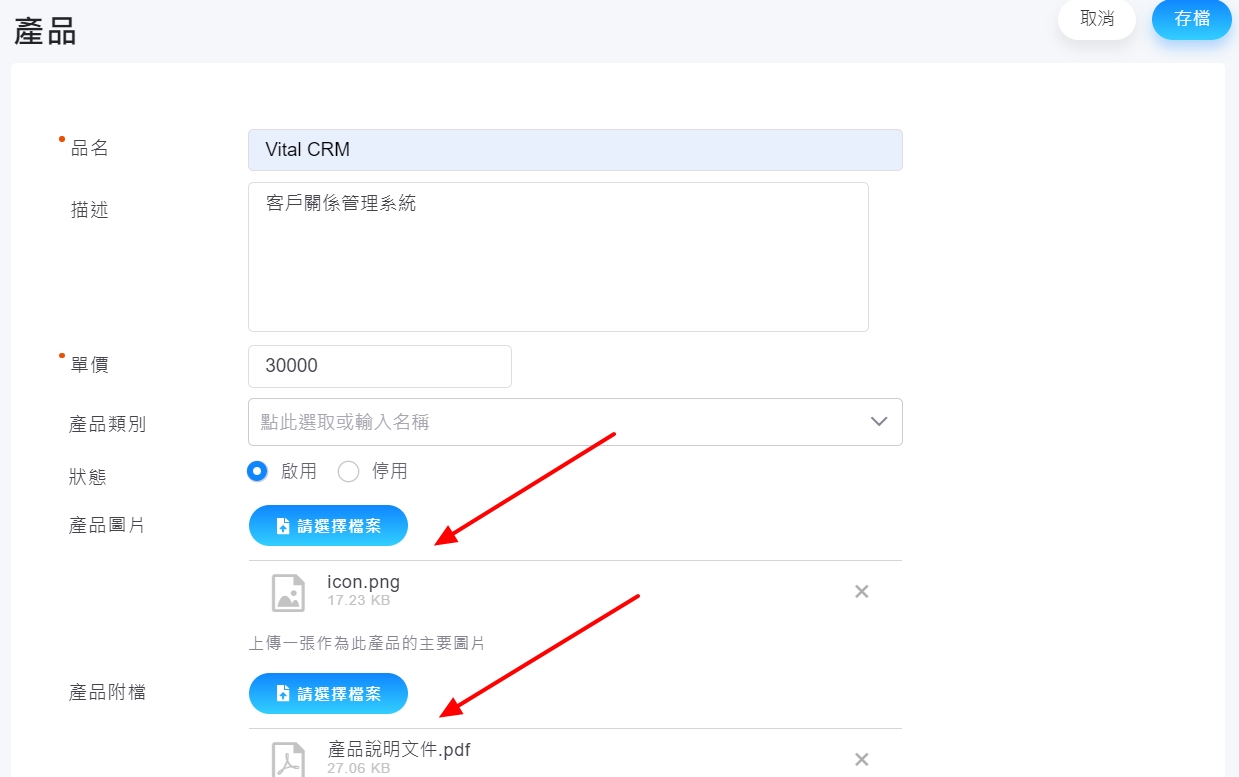 產品資料加入了「產品圖片」與「產品附檔」,可以上傳產品相關的圖片與各式檔案。