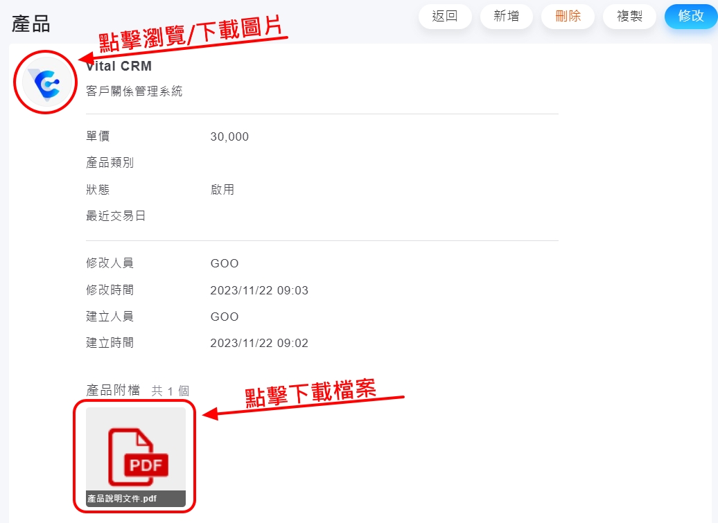 產品詳細資料畫面可以查看產品圖片與附檔。
