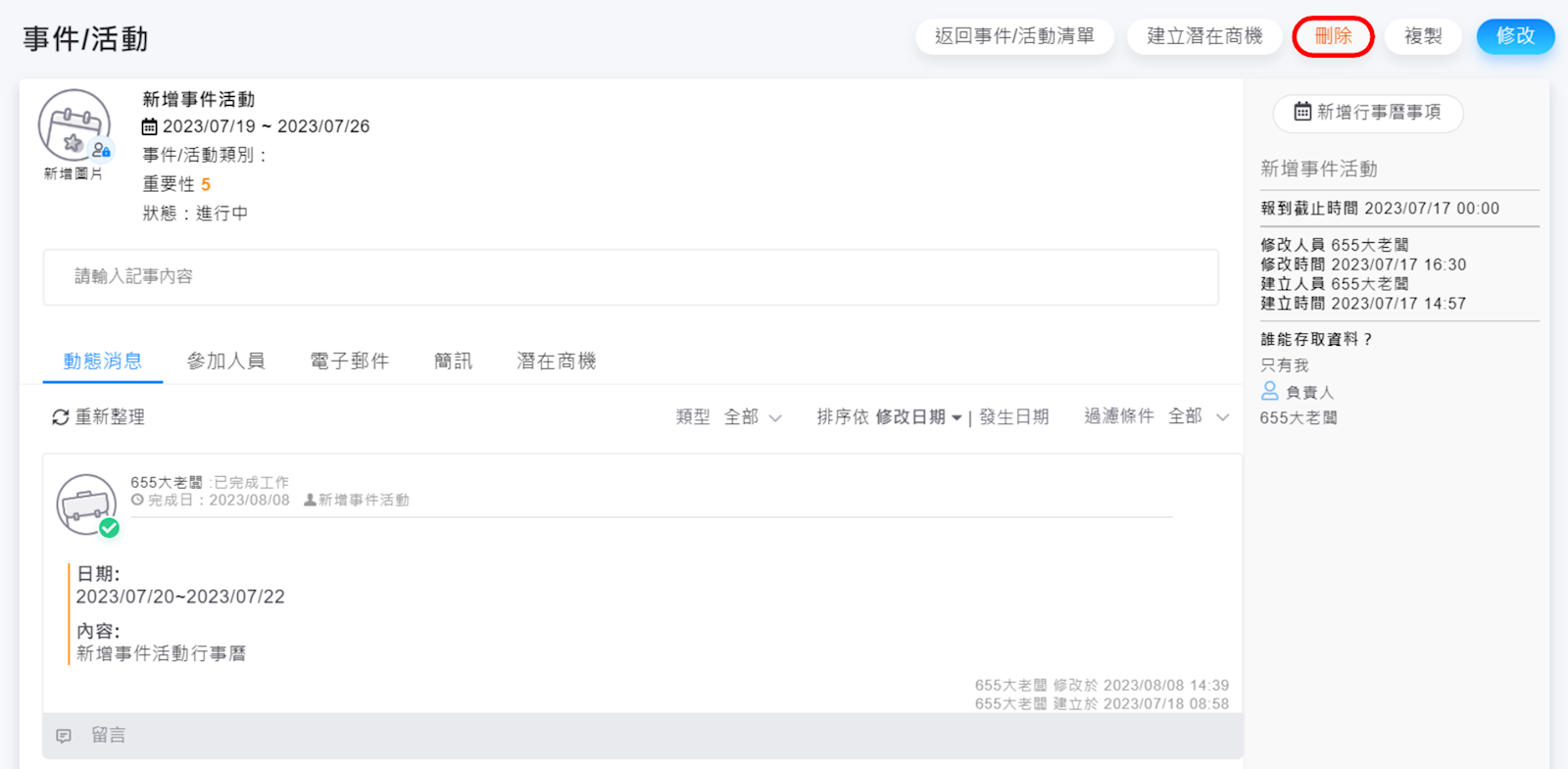 可以,請至列表左方【事件/活動】選擇您要刪除的事件活動,然後點選右上角【刪除】按鈕。刪除【事件/活動】關聯的參加者都會被刪除,但參加者都會存在客戶資料,因此客戶資料還是存在CRM系統。