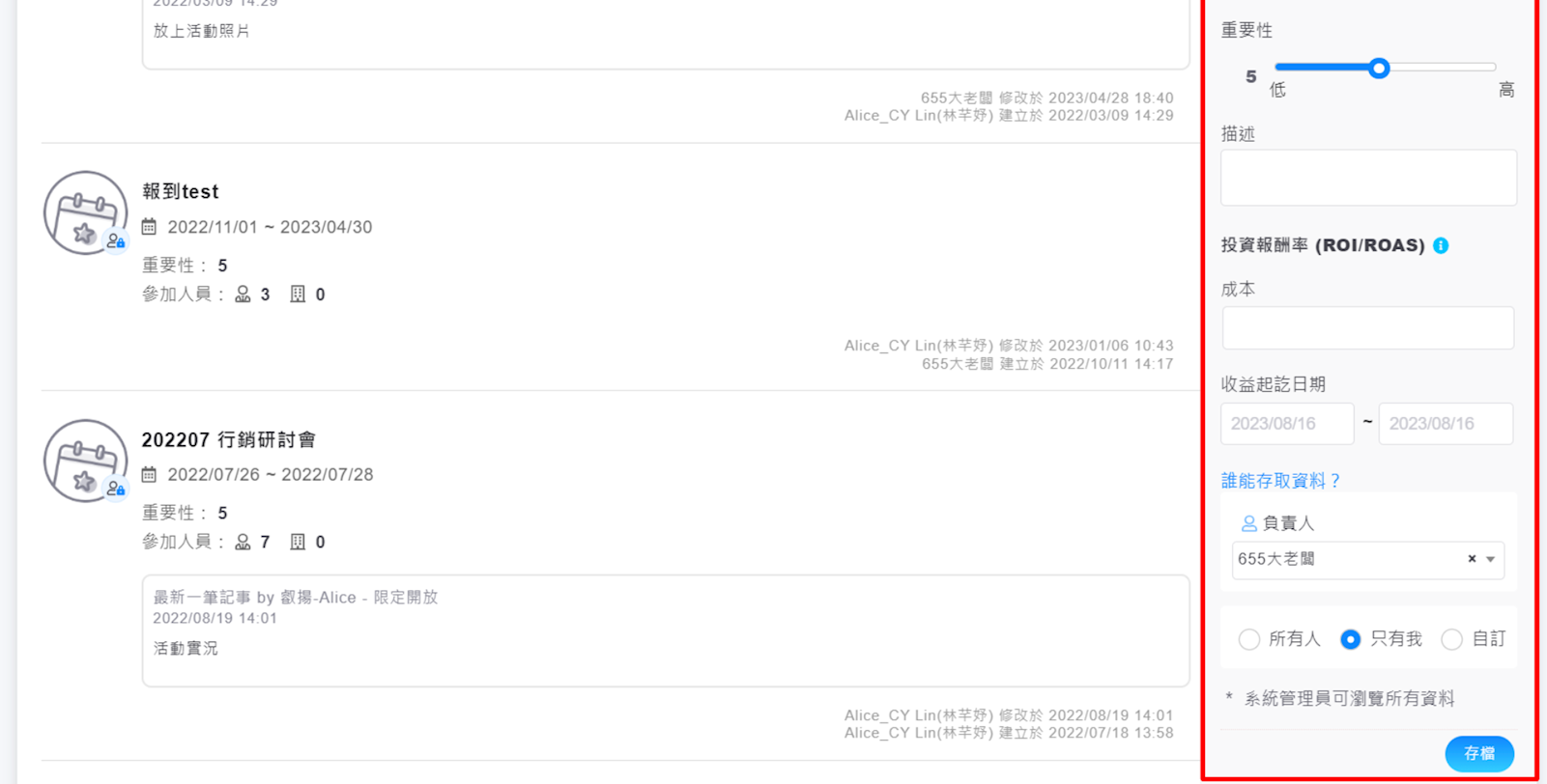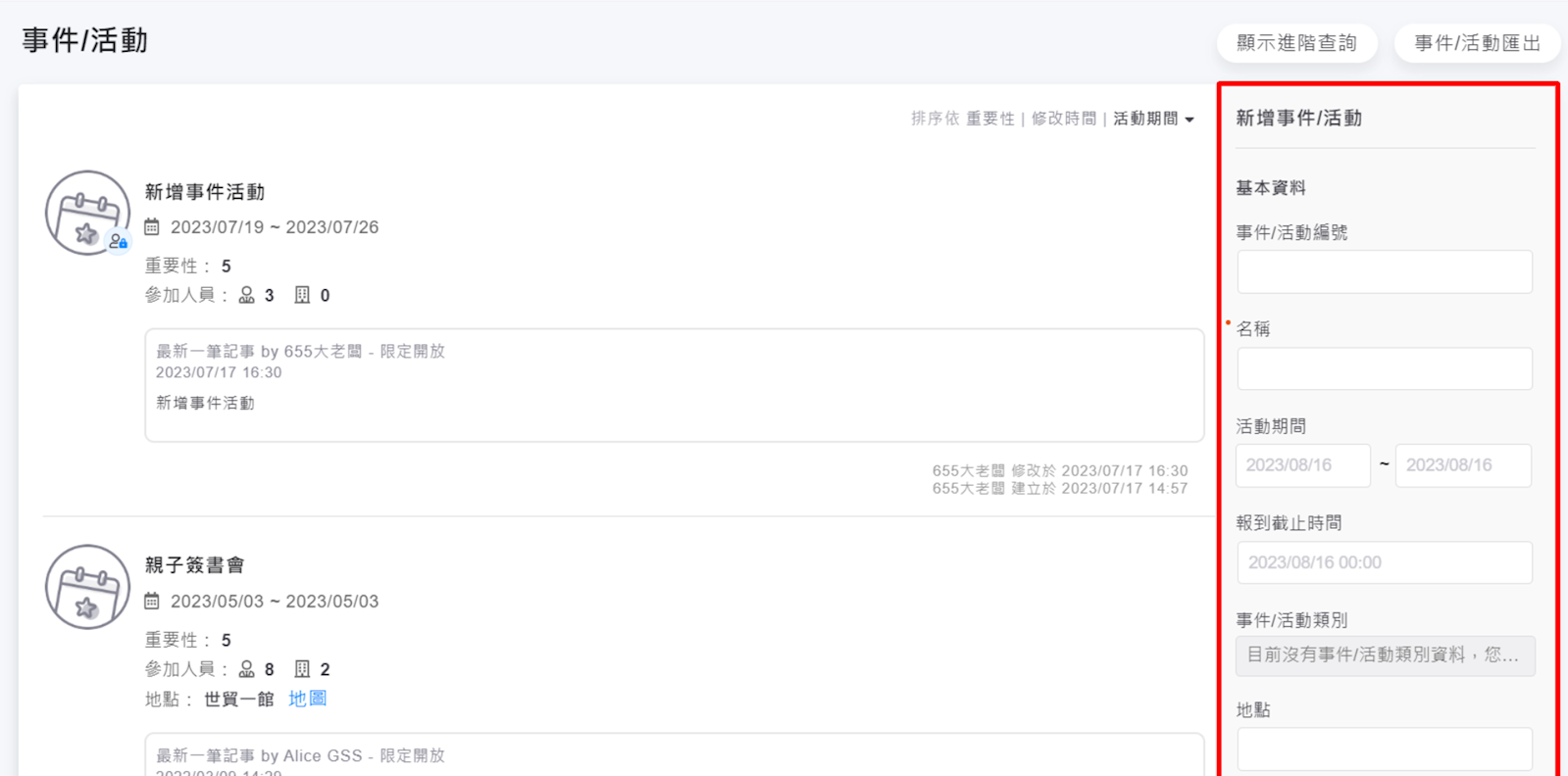 【事件/活動】功能可管理活動相關的記事與參與者。請至列表選擇【事件 / 活動】進入,於畫面右方填寫活動資訊,包含事件活動名稱、活動期間、地點和描述,也可設定權限,確認無誤後點選下方【存檔】即完成新增。