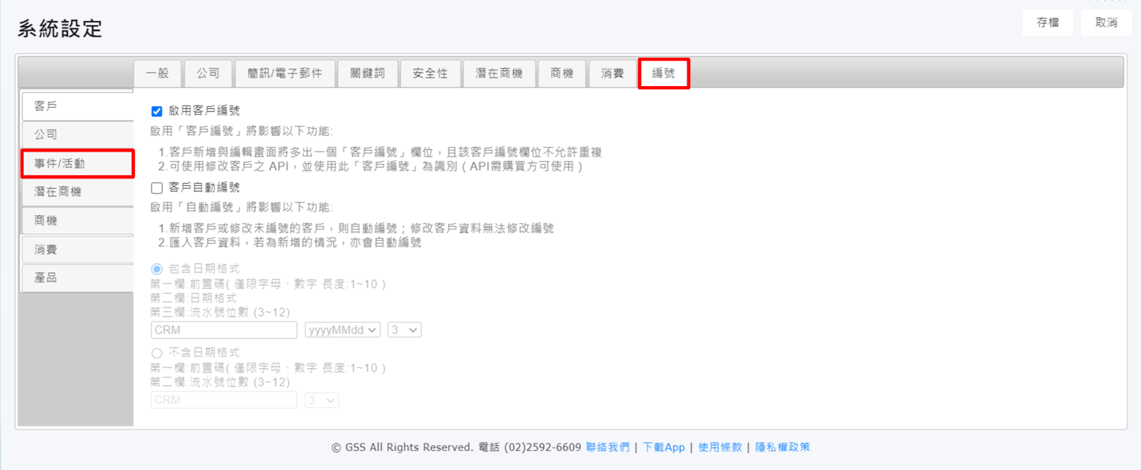 開啟編號後,新增【事件/活動】時即可指定編號欄位,匯入潛在商機時,也可以透過編號指定關聯事件/活動。