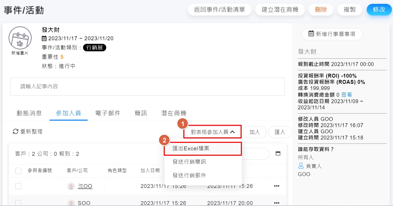 事件/活動的詳細資料頁面,切換至「參加人員」頁籤後,可以點選【對表格參加人員>匯出Excel檔案】,將篩選後的參與者匯出。