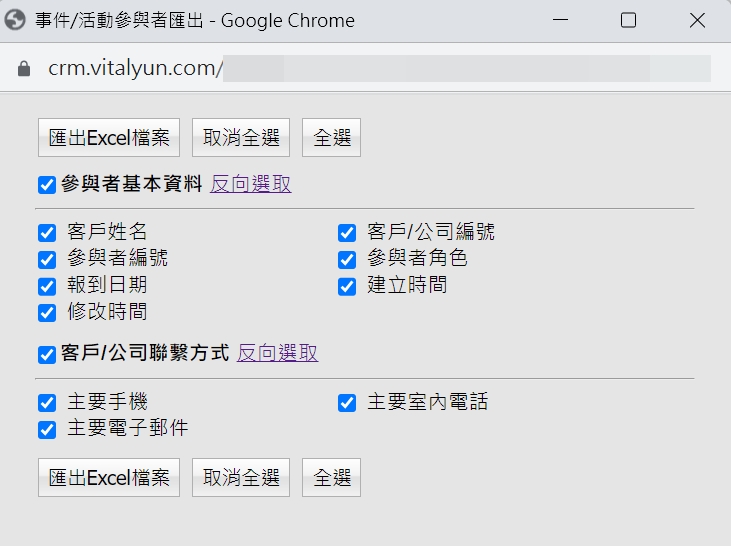 匯出時可選的欄位如下圖,包含客戶/公司的主要聯繫方式。
