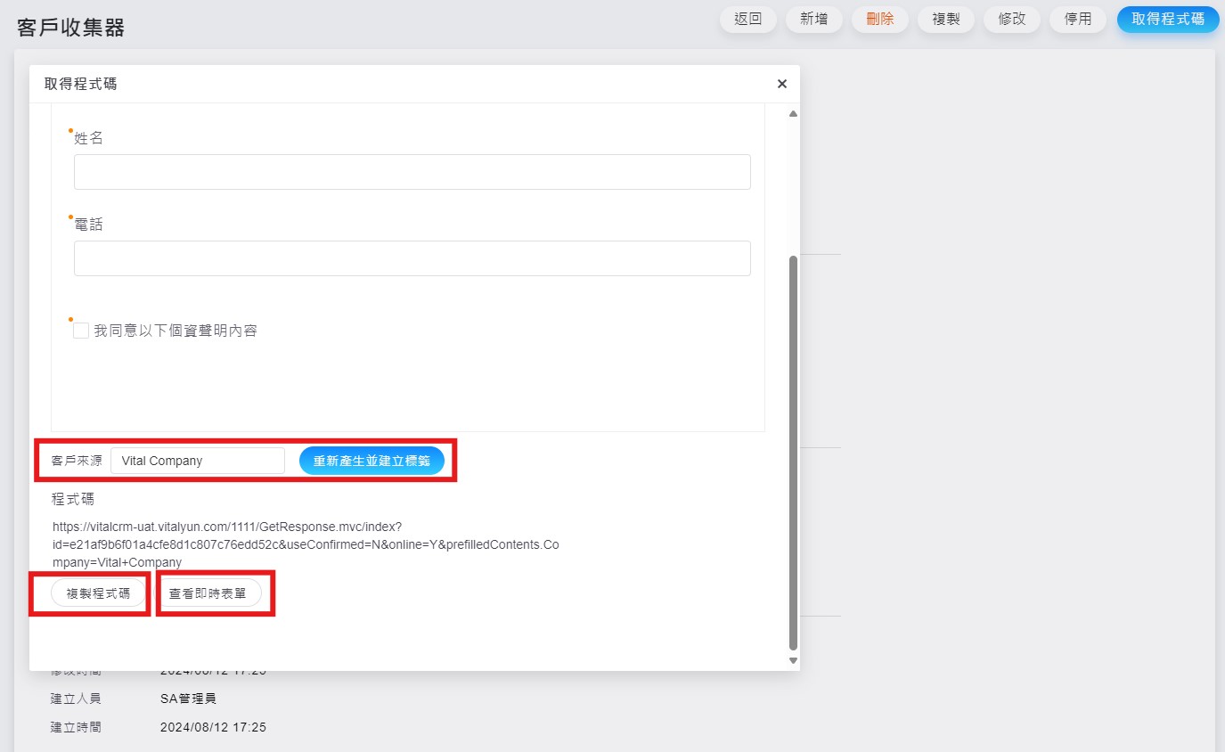 2. 填寫完預填內容後,捲動至表單最下方,可以結合原有的【客戶來源】功能,為填寫者加入區分來源的標籤;點擊【複製程式碼】,可以將預填網址複製起來;點擊【查看即時表單】,於新分頁開啟預覽表單。