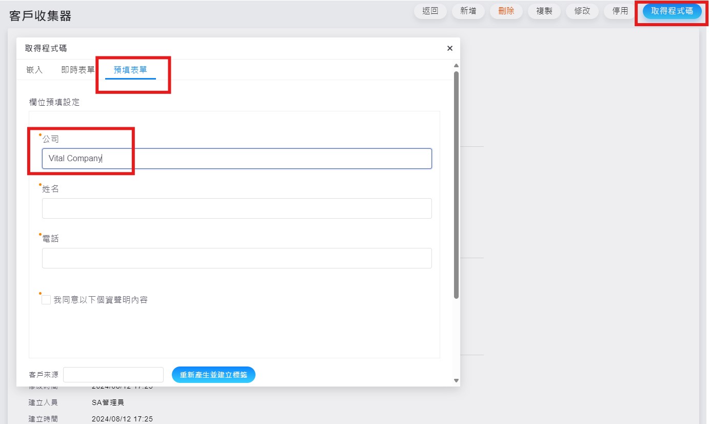 1. 進入欲產生表單連結的客戶收集器,於右上方點擊【取得程式碼】,再點擊【預填表單】頁籤即可進行預填欄位設定。