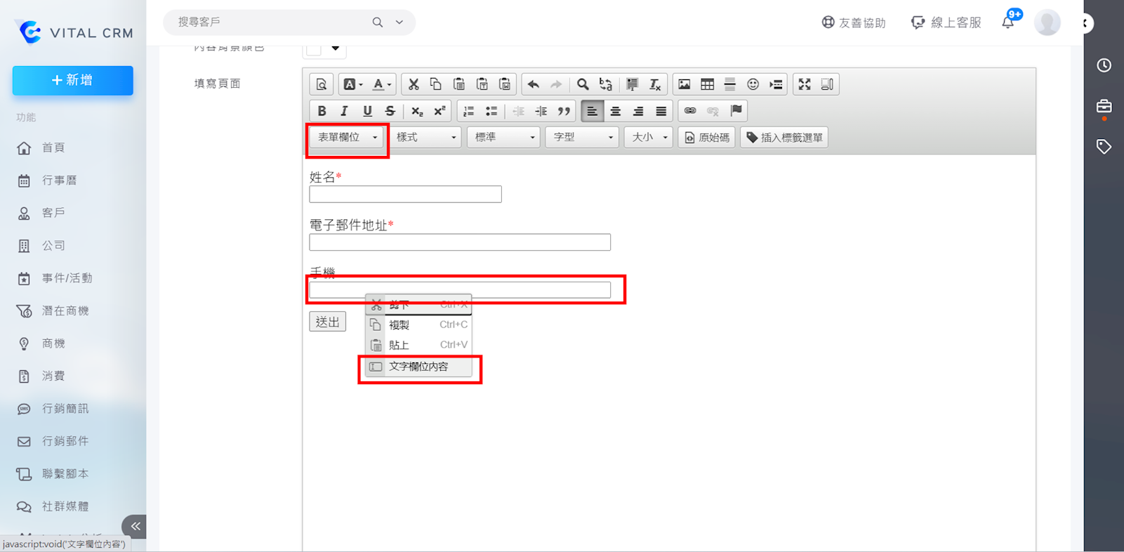 二、在「表單欄位」加入填寫的欄位>對欄位點選右鍵>選擇「文字欄位內容」