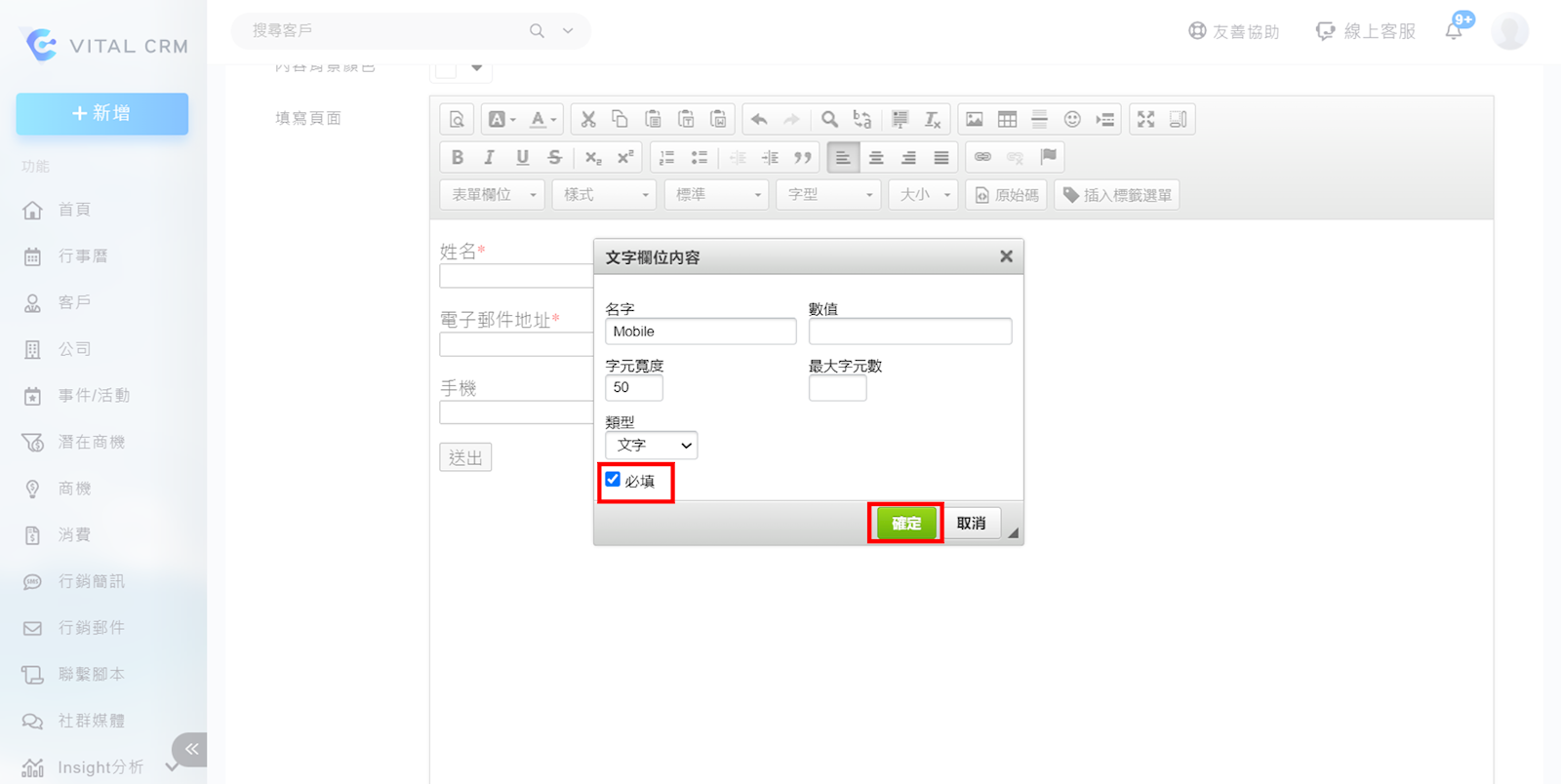 三、勾選「必填」>「確定」,這樣外部表單就會是必填,由於這樣的方式不會有紅色的*字,需自行手動複製貼上