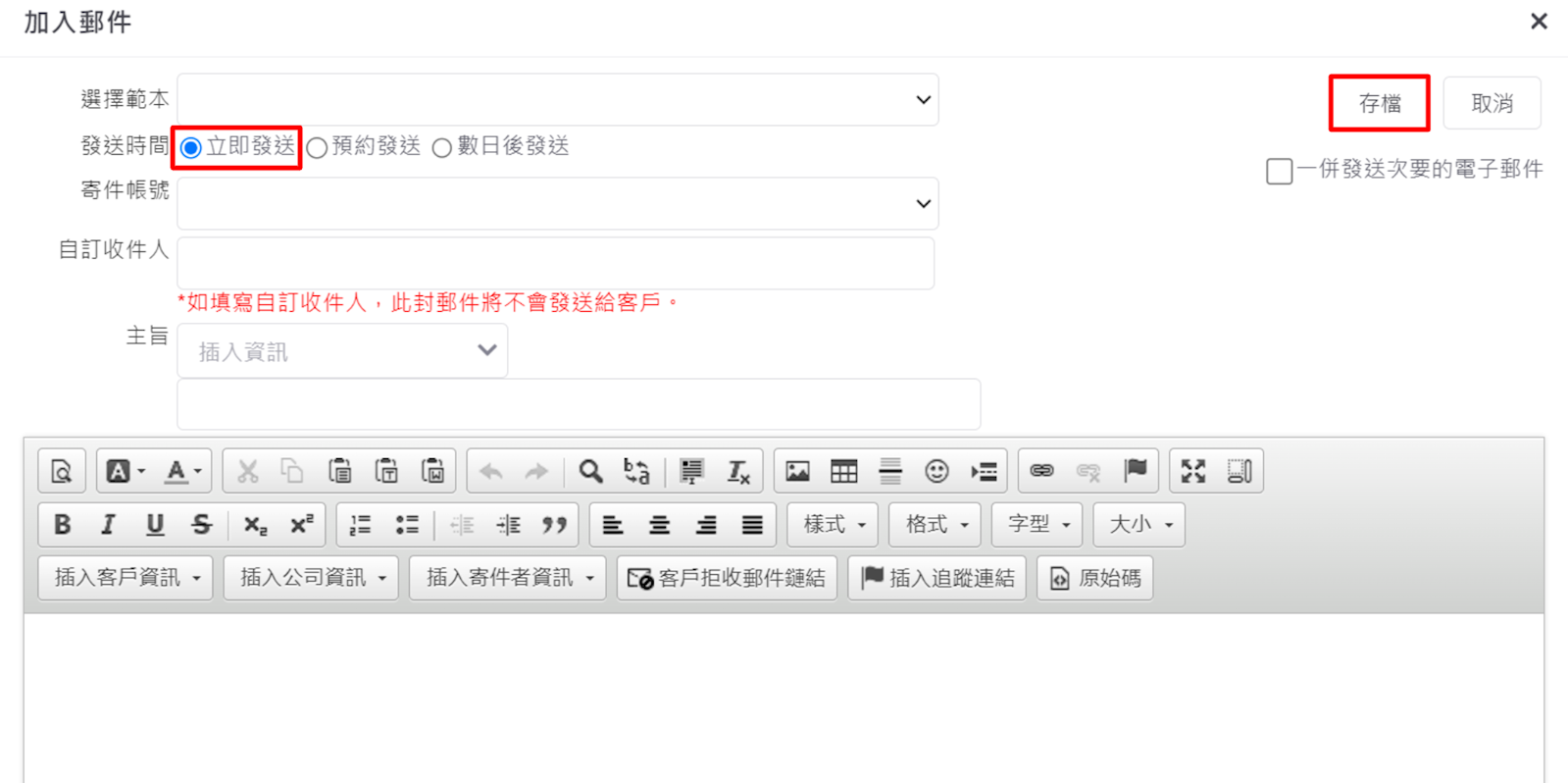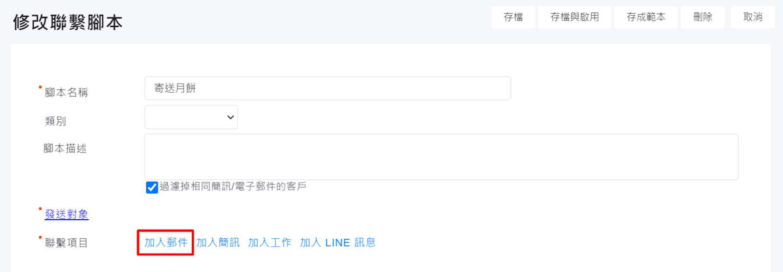 1.設定聯繫腳本:請至列表左下方點選【聯繫腳本】,選擇您欲設定/新增的聯繫腳本,點選【聯繫像>加入郵件】,填寫信件內容並選取【立即發送】,確認無誤後【存檔】,該郵件即被加進聯繫腳本中。