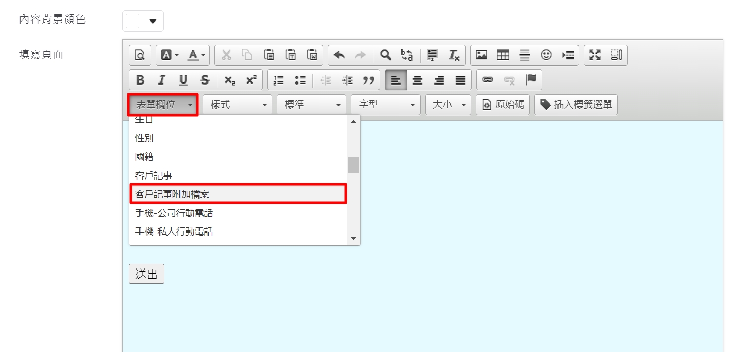 在【表單欄位】的下拉選單中選擇「客戶記事附加檔案」。